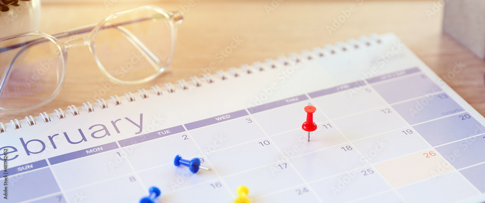 Calendar, Close-up red pin on blank desk calendar with office equipment concept of event planner or personal organization for business and appointment reminder and schedule planning.