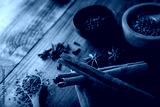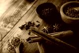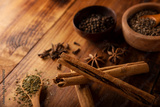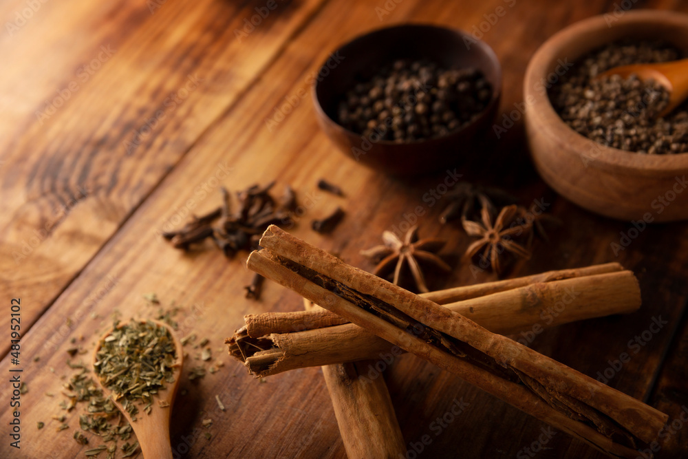 Cinnamon sticks and various spices on wooden rustic board background. Pepper, cardamom, clove, star anis, dehydrated parsley. Close up
