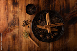 Various spices on wooden rustic board background. Pepper, cardamom, clove, cinnamon, star anis, dehydrated parsley..Flat lay