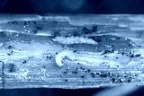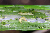 Caterpillars of leek moth or onion leaf miner Acrolepia assectella family Acrolepiidae. It is Invasive species a pest of leek crops. Larvae feed on Allium plants by mining into the leaves or bulbs