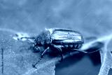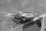 Small June Beetle Amphimallon solstitiale sitting on the damaged plant leaf.