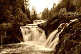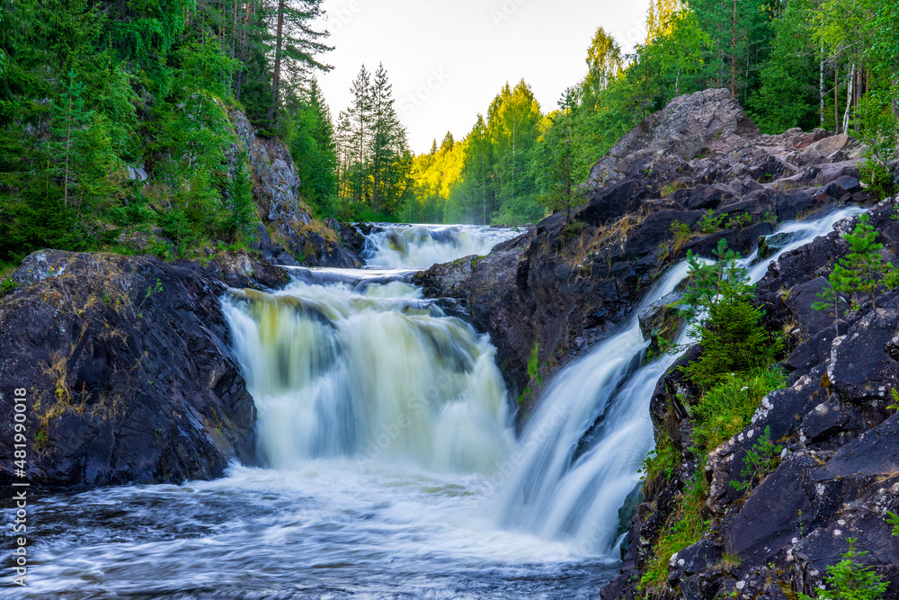 Beautiful landscape with waterfall in northern forest on summer evening. Powerful stream of water among stone rocks and green foliage. Kivach waterfall at Suna river in Karelia, Russia