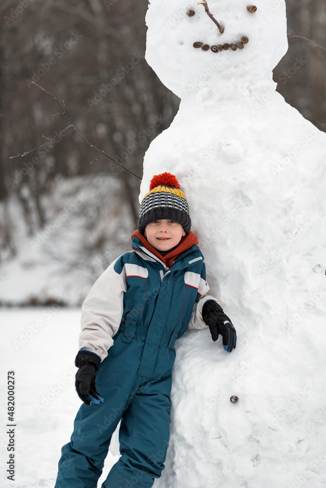 Portrait of boy in knitted hat and overalls next to large snowman. Child playing with snow man.