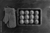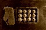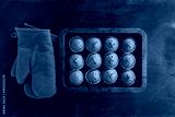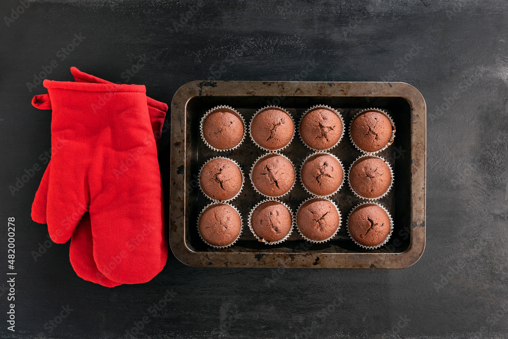 Chocolate brownies cacao muffins on baking and red pot-holders on black background. Just cooked homemade cupcake.