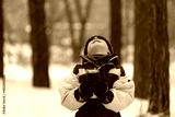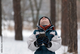 Portrait of child with mug in his hands on winter forest background. Boy looks up at the sky.