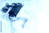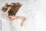 Beautiful young woman sleeps in her bed on white sheets at home. Top view portrait of sleeping girl with long loose hair. Copy space