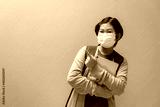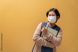 Asian young girl wear a protective mask holding tablet and books pointing finger hands up to copy space she wear sweater jacket and carry backpack shirt shoot in isolated on ellow background