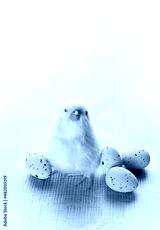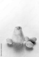 Easter eggs and yellow chicks on a grey background. The minimal concept. An Easter card with a copy of the place for the text