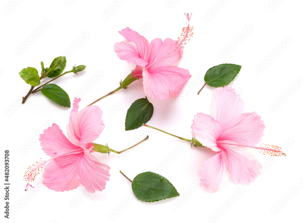 Pink hibiscus flower with leaf isolated on white background, Fresh hibiscus flower on White Background