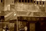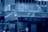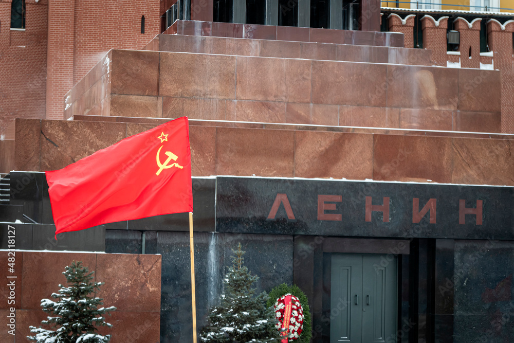 red flag of the Soviet Union with a hammer and sickle on the background of the Lenin Mausoleum. Communism in Russia is a concept