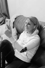 Happy young woman using smartphone app enjoying online virtual chat, video call with friends in distance virtual meeting or recording stories for social media at home.