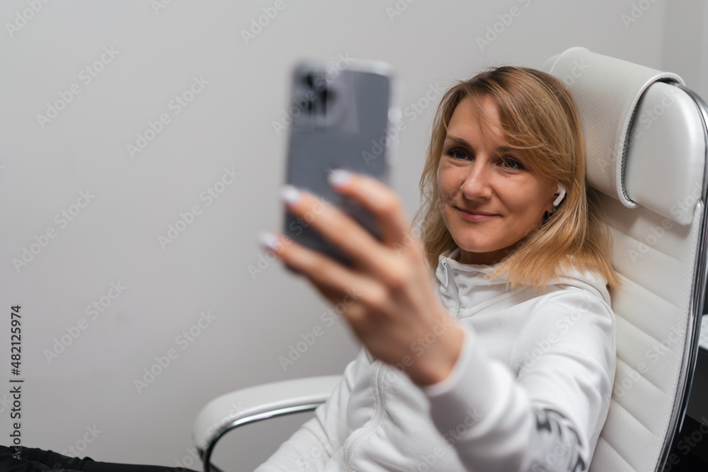 Beautiful young woman taking selfie while sitting on white computer chair at home