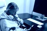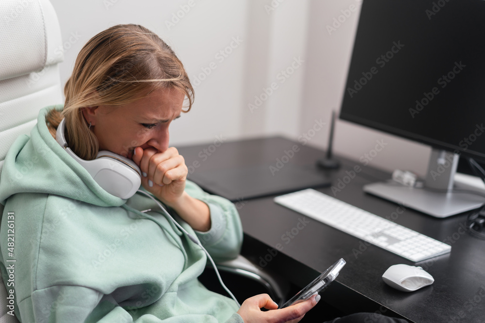 Sad young woman receiving bad news online in a smartphone sitting at the desk at home