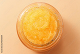 Close-up of a glass container with an orange-colored sugar body scrub, top view.