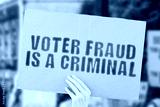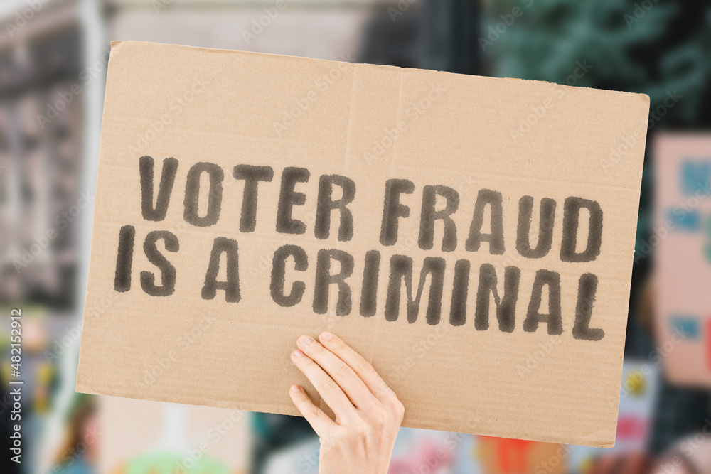 The phrase " Voter fraud is a criminal " on a banner in men's hand with blurred background. Presidential election. Vote. Government. Power. Illegal. Violation. Law. Unlawful