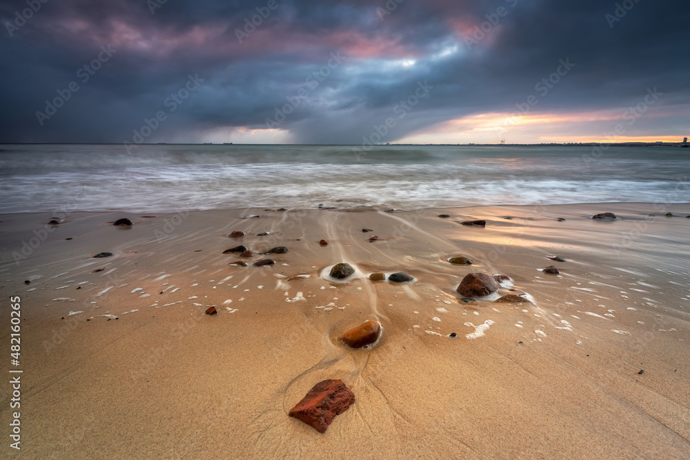 A beautiful sunrise on the Baltic Sea beach in Gdynia Orłowo. Poland