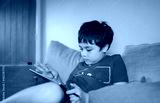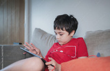 Kid sitting on sofa watching cartoon or playing game on tablet, Child boy using digital pad learning lesson online on internet, Home schooling,Distance learning online education concept