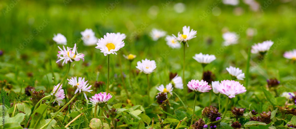 Many beautiful daisy flowers on a green meadow. Flower glade. Design idea for kitchen glass back wall.
