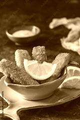 Fish fingers with lemon and sour cream on a blue background, vertical