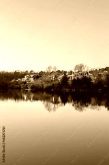 Houses by the Cary Lake Park under golden light sunset on a winter day