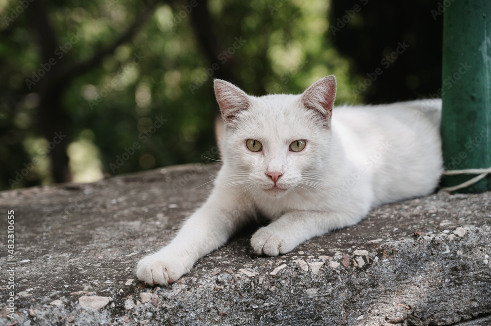 A white street cat lying on a concrete slab. Gurzuf cats