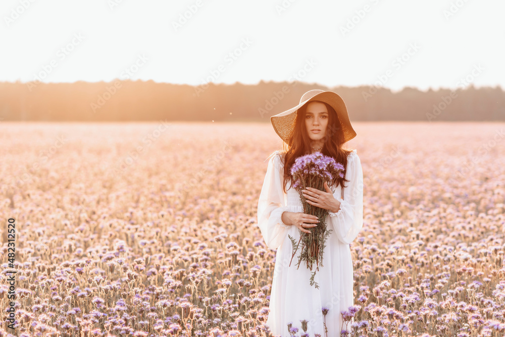 A beautiful girl in a lavender field. A beautiful woman in the style of provence in a white dress with a bouquet in her hands.