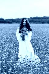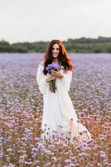 A beautiful girl in a white dress in a blooming field of Provence in a romantic atmosphere