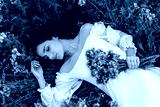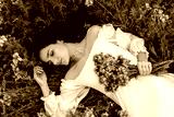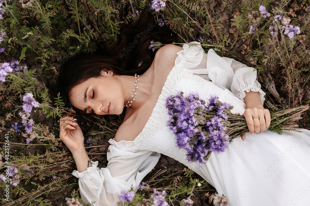 A young beautiful girl lies with her eyes closed in a blooming field of Provence. Romantic atmosphere