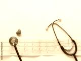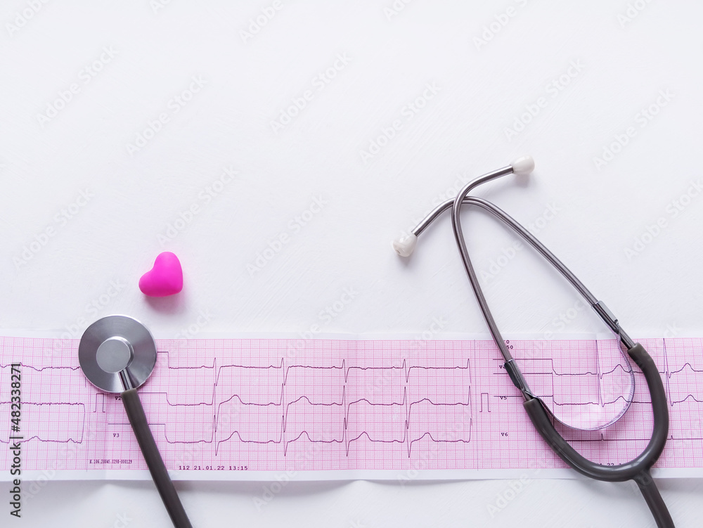 ECG diagram paper phonendoscope medical examination background. Cardiogram of young adult Prevent disease, mitral valve prolapse or click-murmur syndrome. Analyze graph people heart rate measurements.