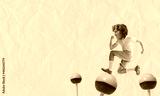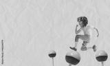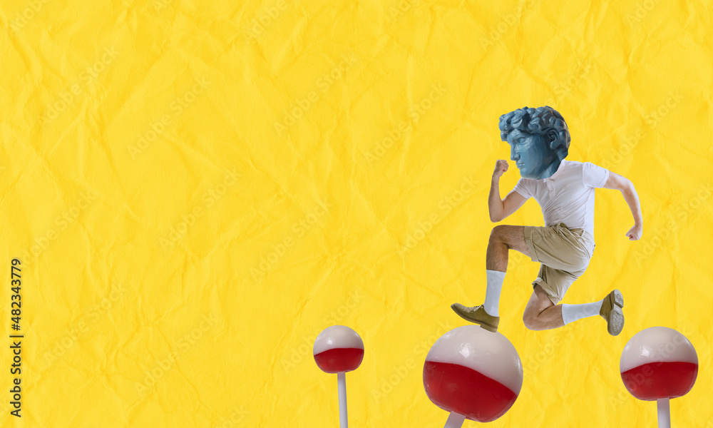 Contemporary art collage with young man with plaster head of ancient statue jumping on lollipops isolated on yellow background. Comparison of eras