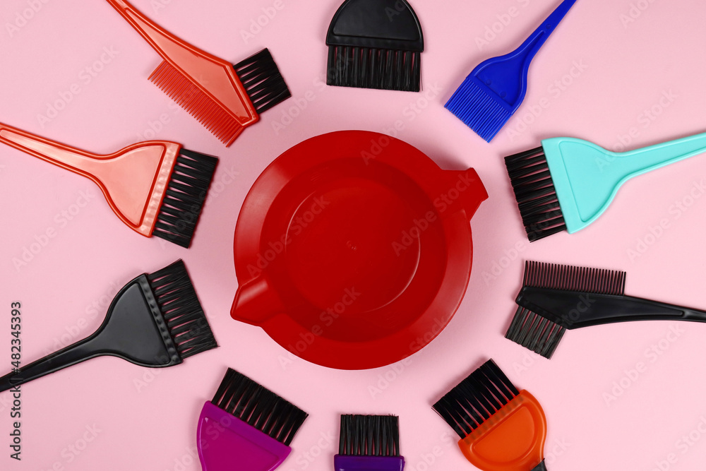 Hair coloring tools - plastic dye bowl and brushes on pink background