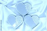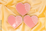 background banner greeting card for valentine's day with gingerbread pink heart icing cookies with on silk fabric background