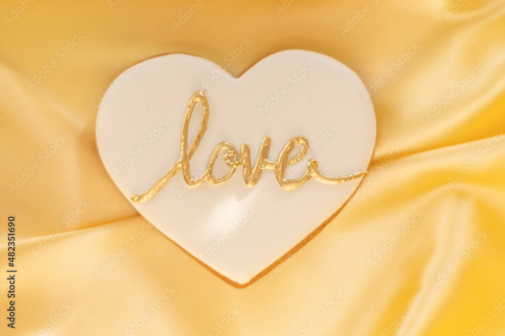 background banner greeting card for valentine's day with gingerbread pink heart icing cookies with on silk fabric background