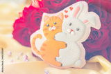 background banner greeting card for valentine's day with bouquet of red roses and gingerbread heart cookies with cat and rabbit hugs on silk fabric background