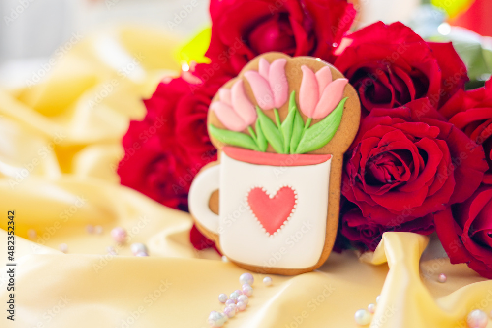 background banner greeting card for International Women's Day with bouquet of red roses and gingerbread cookies cup with pink tulips on silk fabric background