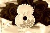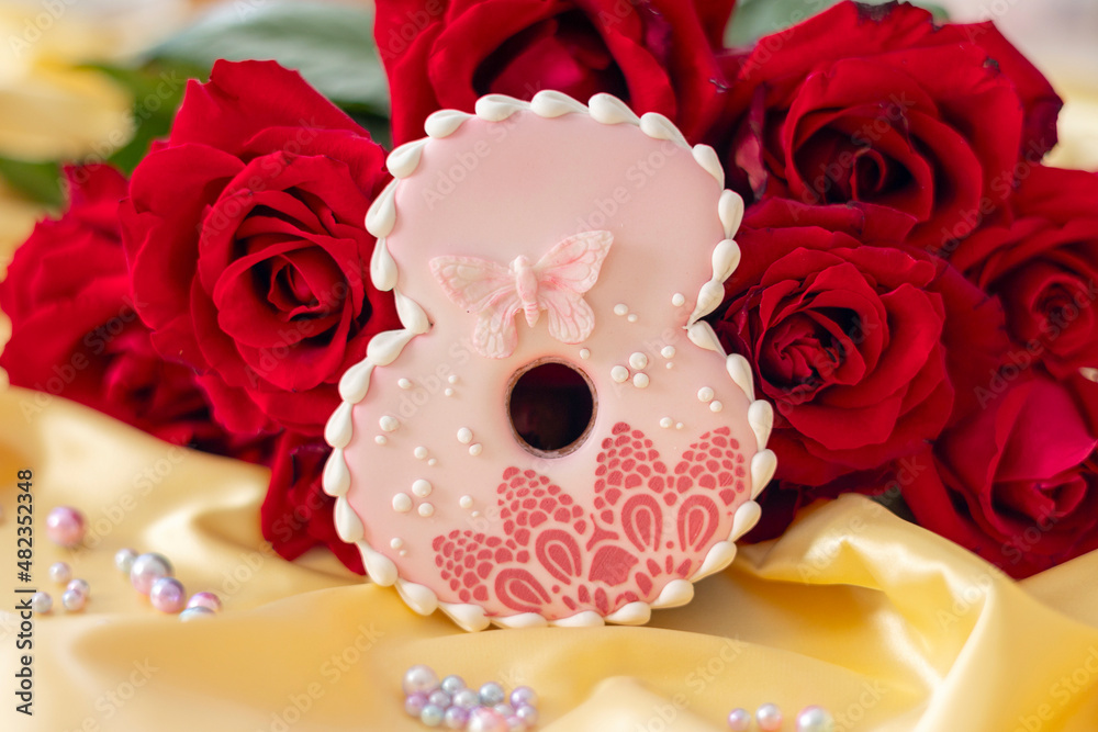 background banner greeting card for International Women's Day with bouquet of red roses and gingerbread cookies pink number 8 on silk fabric background