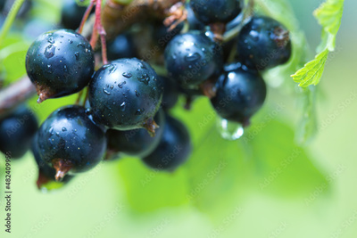Black currant berries in dew drops on a bush in the summer garden.