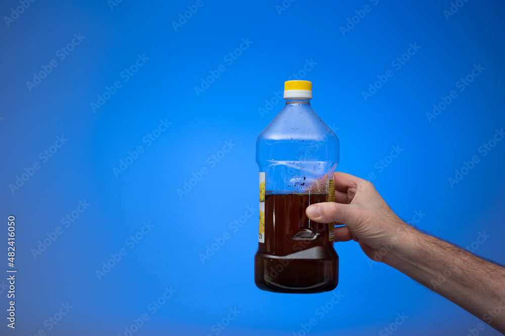 Spent cooking oil recycling in a clear plastic bottle. Held in hand by man. Close up studio shot, isolated on blue background