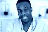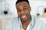 Close-up portrait of a handsome successful dark-skinned young man, african american attractive guy, in casual clothes, stands indoors and looking at the camera, smiling friendly
