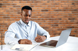 A young African American man holds a business meeting with colleagues. Cute successful smart guy company director or manager using laptop and notepad for encore negotiation with colleagues or clients.