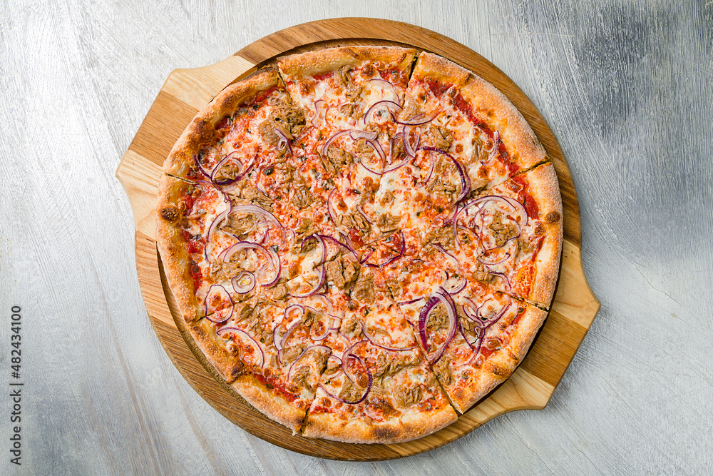 Pizza with tuna and red onion on the board on grey table top view