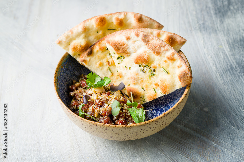 Tartare from beef with bread on bowl on grey table