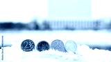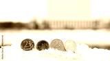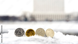 A coin worth two Russian rubles against the background of the government house in Moscow