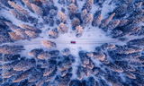 Red car driving on winding road through snowy forest, toning blue. Concept banner winter travel, aerial view