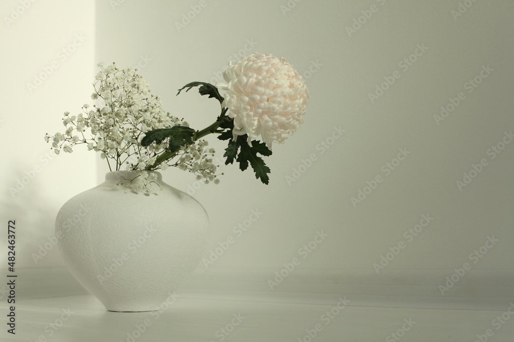 Beige chrysanthemums and gypsophila flower in vase on white interior. Minimalist still life. Light and shadow nature horizontal background.