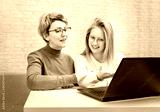 Cute smiling teen girl and mother using laptop in the house. Mother and Daughter at Home. Teenage Girl.