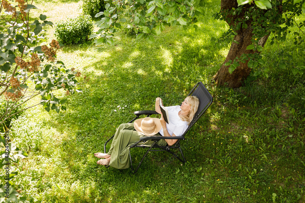 Woman reading a book in garden recliner chair. Summer vacation in the yard. Mature Scandinavian female life in retirement. Good living. View from the top. Beautiful middle aged woman resting