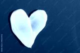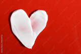 Texture smear of cream in the shape of a heart. Cosmetic product on a red background, top view. Beauty concept.
