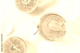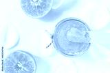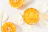 Homemade sugar scrub with orange slice top view. Beauty product for spa procedures and peeling.