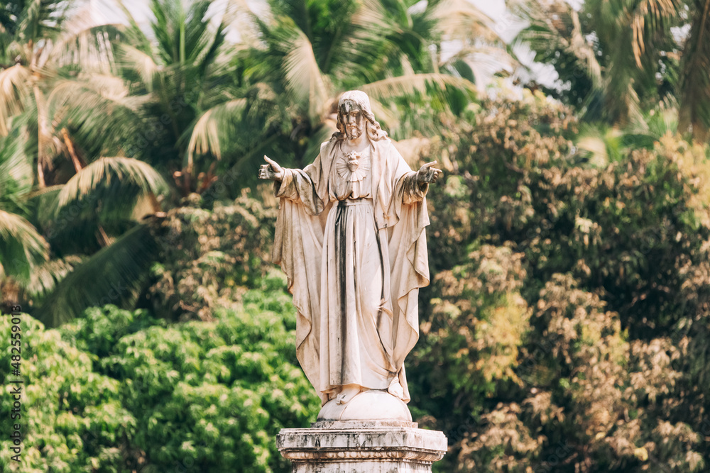 Old Goa, India. Cathedral Of St. Paul And Statue Of Jesus In Sunny Day.Old Goa, India. Cathedral Of St. Paul And Statue Of Jesus In Sunny Day.